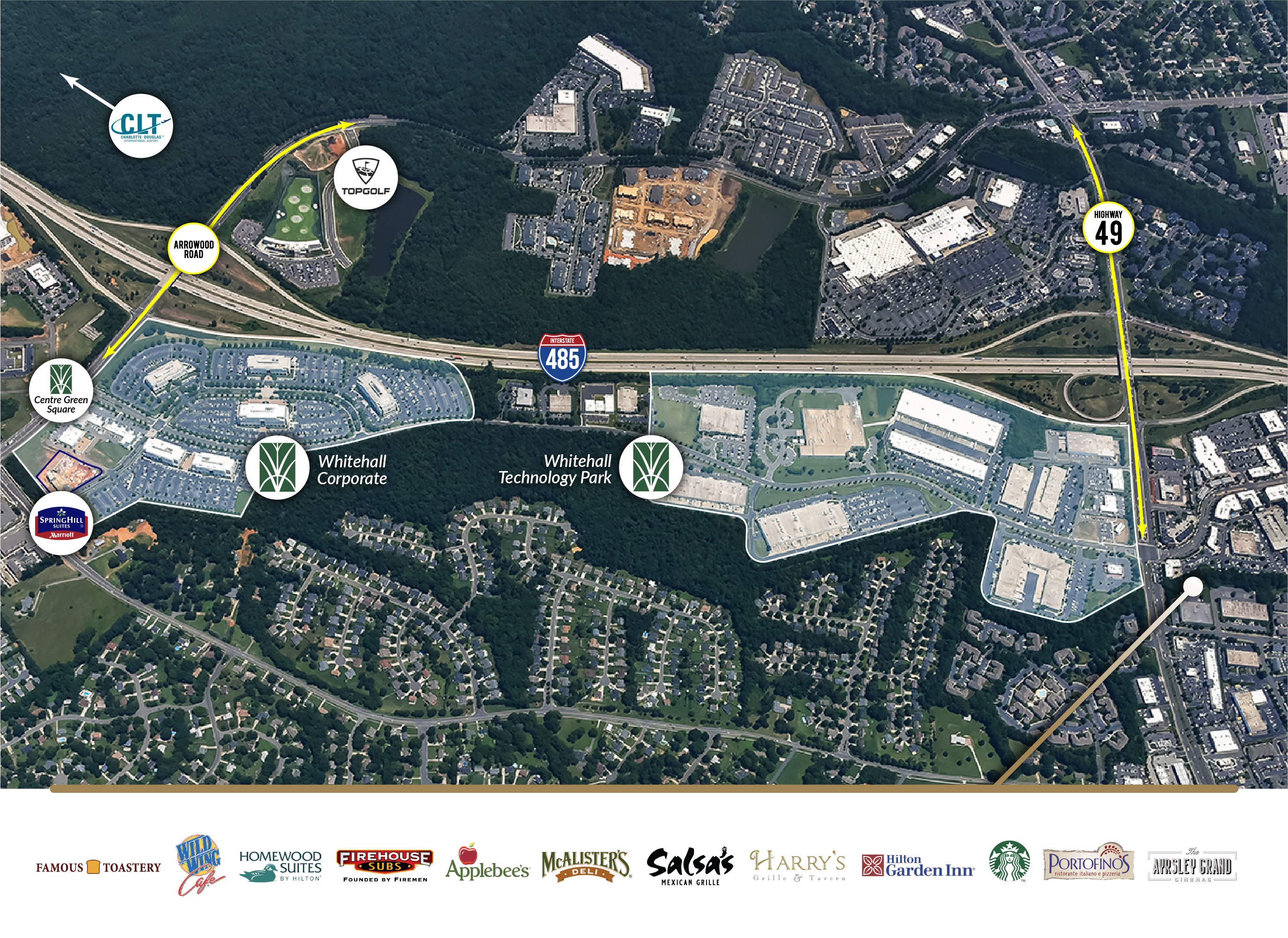 Strategically located on Arrowood Road at I-485, Whitehall Corporate Center boasts unparalelled accessibility. All major Charlotte highways, including I-77, I-485 and I-85 can be easily reached in a few minutes. Uptown Charlotte and Charlotte Douglas International Airport are also in close proximity to the property.